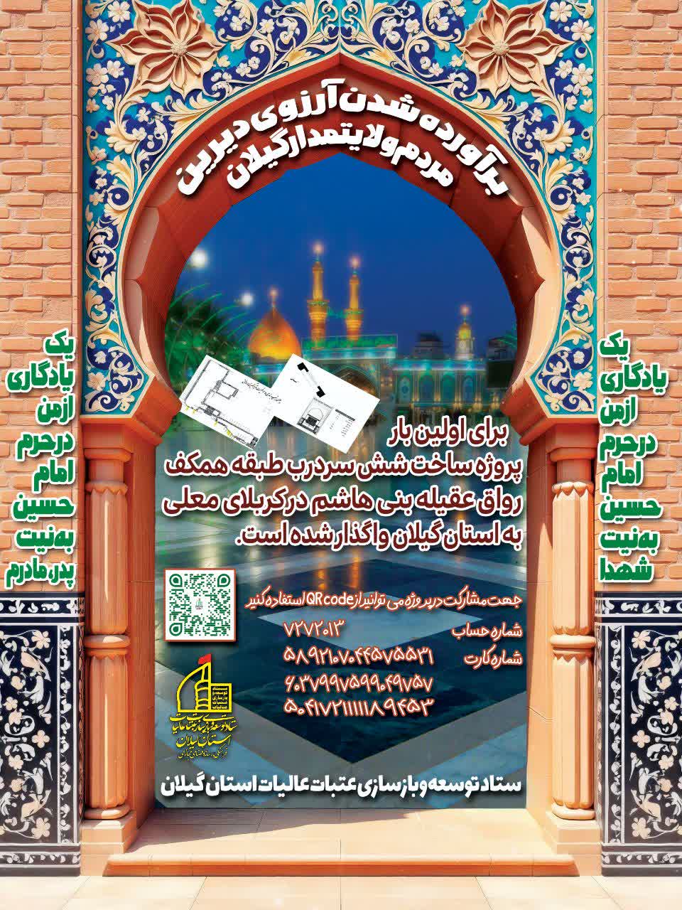 رئیس ستاد بازسازی عتبات عالیات استان گیلان با اشاره به مطالبه گسترده مردم ولایتمدار گیلان برای داشتن پروژهای ویژه در صحنهای مطهر حسینی، افزود: پس از سالها درخواست و پیگیری، این افتخار به مردم گیلان عنایت شد و پروژه ساخت و نصب شش سردرب در طبقه همکف شبستان عقیله بنیهاشم حضرت زینب کبری(س) در جوار مضجع شریف حضرت اباعبدالله الحسین(ع) به استان واگذار گردید.