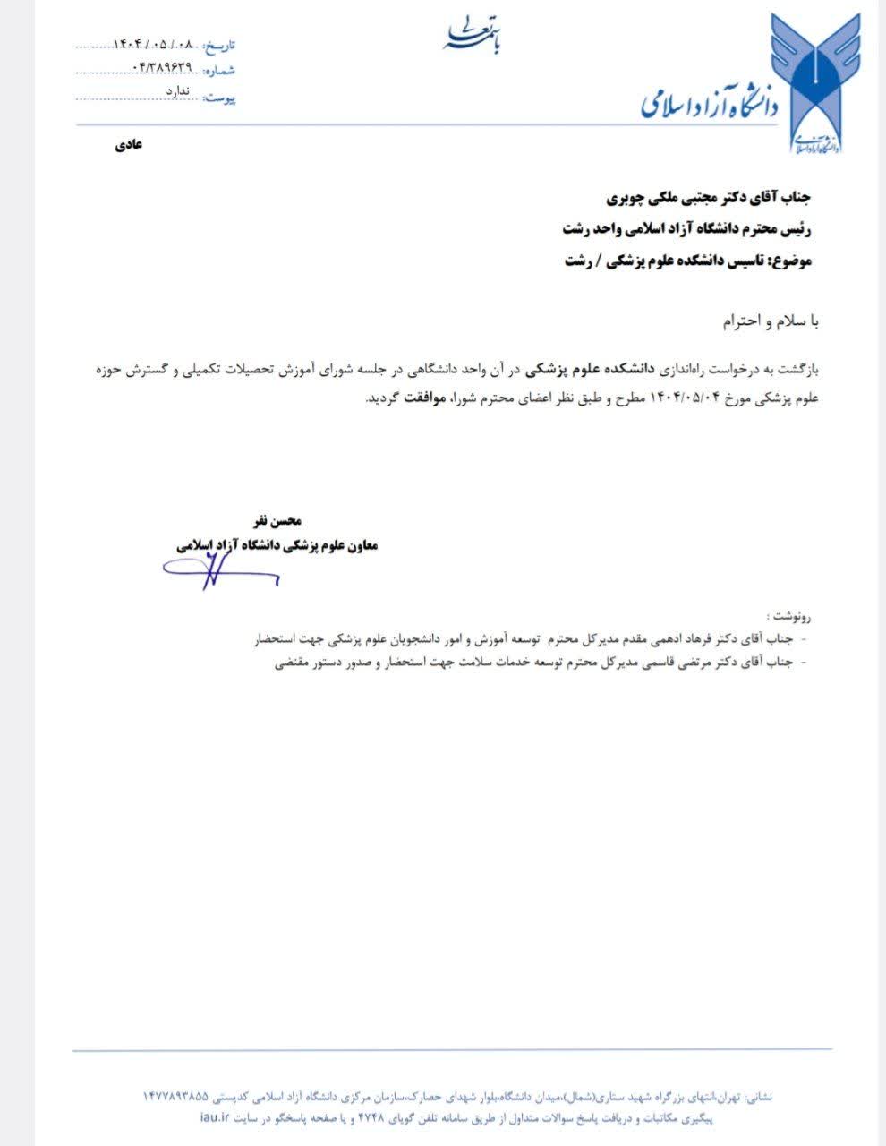 موافقت رسمی با تأسیس دانشکده علوم پزشکی در دانشگاه آزاد اسلامی واحد رشت