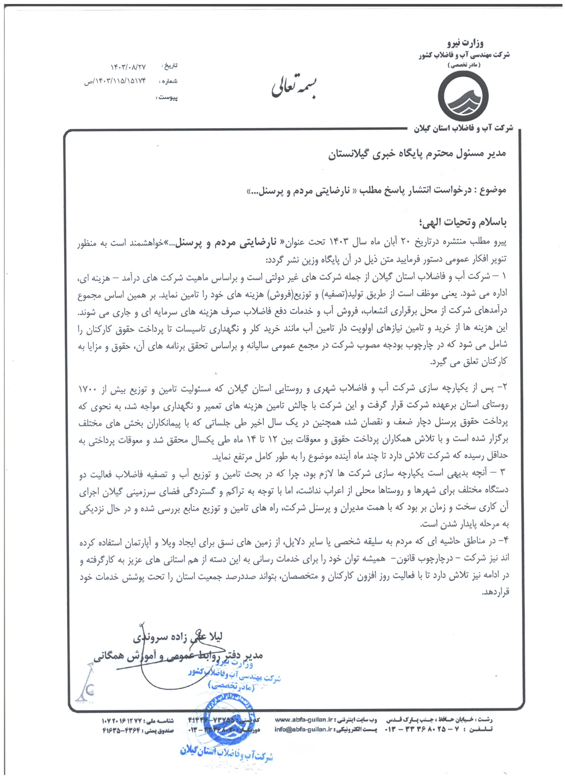 به گزارش خبرنگار سرویس اجتماعی گیلانستان، یکشنبه ۲۰ آبان بود که گزارشی برگرفته از مطالبات مردمی و پرسنل شرکت آب و فاضلاب استان گیلان با عنوان ” درخواستی برادرانه؛ آقای مدیرعامل! ورشکستی آبفا گیلان را اعلام کرده و با یک استعفا همه را خوشحال کنید!” در این پایگاه خبری تحلیلی منتشر شد و به عدم پرداخت حقوق کارکنان حتی تا ۷ ماه اشاره داشت که امروز پس از یک هفته جوابیه‌ای از سوی این شرکت به تحریریه گیلانستان ارسال شد:
